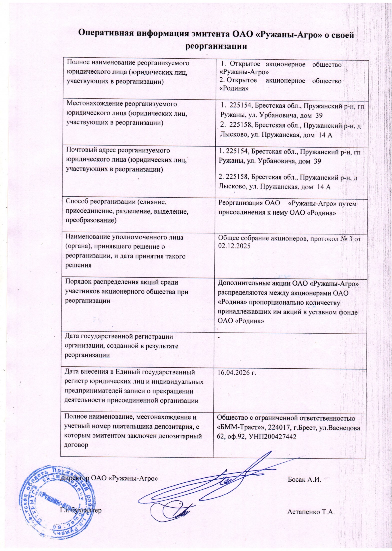 Оперативная информация эмитента ОАО «Ружаны-Агро» о своей реорганизации